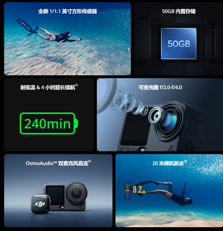 11 月 13 日晚華鑫證券,大疆终于发布Osmo Action 6运动相机:新机换上了Osmo 360那颗1/1.1英寸正方形CMOS,新增4K自由裁切模式(横竖屏视频自由切换),而且加入了可变光圈,光圈可在f/2.0-f/4.0之间自动调整。