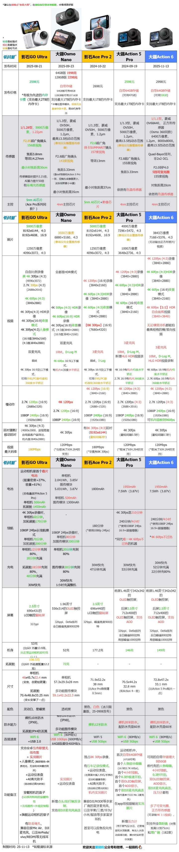 最后例牌,可能是全网最全的【大疆Action 6】、影石Ace Pro 2、大疆Action 5 Pro、大疆Osmo Nano、影石GO Ultra对比,很长的对比表带给大家。